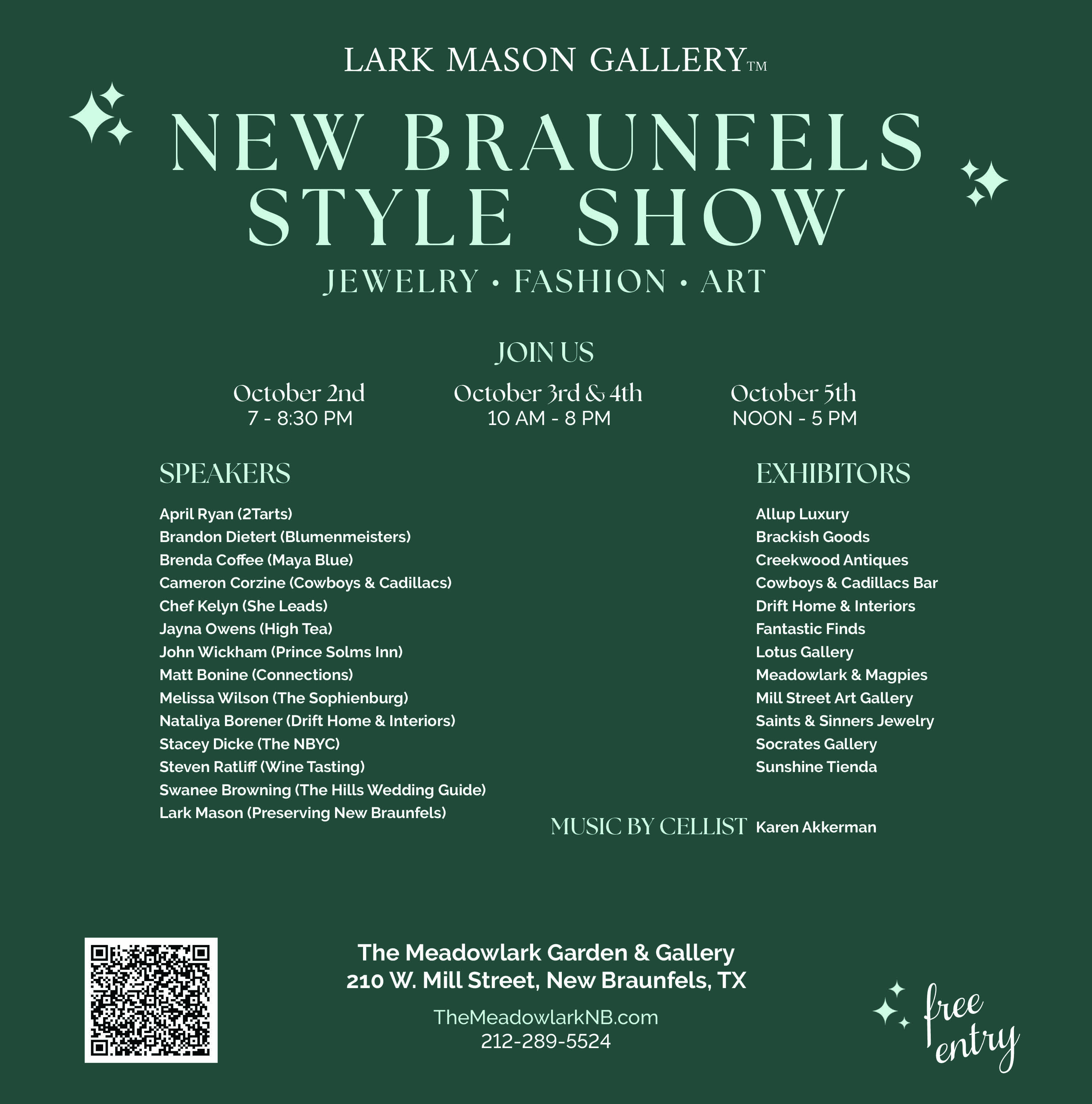 The Meadowlark is a historic gallery space set within a beautiful, contemporary garden in the heart of Downtown New Braunfels. With dedicated spaces for art exhibitions, presentations, and exclusive gatherings, The Meadowlark provides a memorable and flexible setting within walking distance to fine cuisine, music venues, the Brauntex Theater and New Braunfels stunning courthouse and historic square.